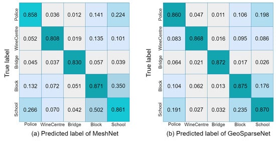 For further analysis, we present a comparative assessment of prediction classification labels between MeshNet [56] and GeoSparseNet using confusion matrices. Figure 6 visually demonstrates the distinct predictive performances of both models when incorporating geometric and photometric features (as shown in (a) and (b) respectively). Notably, when both types of features are utilized together, we observe significant differences in how the models classify certain labels. Particularly in the case of MeshNet (a), there is a noticeable confusion between the school and police classes. This confusion might stem from two probable reasons: Firstly, there could be instances where distinguishing between these classes during the annotation process proves challenging. Secondly, within this configuration, the dominance of photometric features over geometric ones might contribute to this confusion. Upon evaluating GeoSparseNet (b), our findings corroborate the argument that our method generates more discriminant features, significantly impacting all five classes. Notably, GeoSparseNet demonstrates a reduced tendency for confusion between classes, suggesting its ability to maintain clearer distinctions without an over-reliance on specific features.