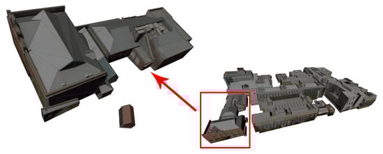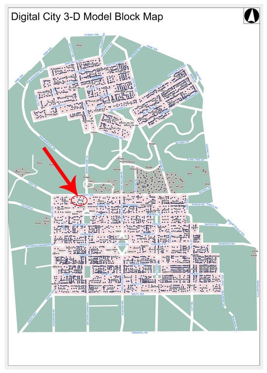 We used the Large-scale 3D City Model Adelaide dataset’s building mesh models, each having irregular planar area connectivity and attributes from different building architectures, to assess the effectiveness of the suggested strategy. Our method can certainly involve identifying and distinguishing different types of regions or elements within a three-dimensional space, regardless of whether they are coplanar or non-coplanar. The whole city block with its varied building structures is seen in Figure 11. Figure 8 provides an illustration of block-1 among various buildings, which is shown by the red arrow in Figure 11.