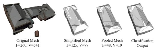 The evolution of the result on a block-1 building model produced by aerial photogrammetry methods is shown in Figure 9. The suggested technique is successful in recognizing contour and geometric features, structured areas, and flattening surfaces. There could be some overly smoothed or very curved areas in the original mesh models. Since our classification technique does not divide these curved regions, it uses LKA-based edge collapse operators to simplify unstructured sections, such as air conditioners on rooftops. A significantly reduced number of faces characterizes the structural elements, such as the building’s major facade, which are much simplified using GeoSparseNet. By comparing, we can see that the model’s triangle number has drastically decreased after the mesh pooling operation. The outcome demonstrates the ability of our approach to produce and categorize well-decimated meshes with respect to geometric precision (Figure 9), visual coherence, and classification (Figure 10).