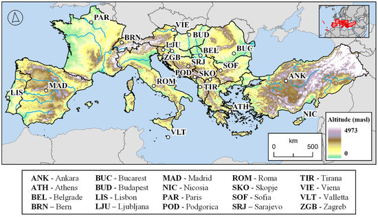 In terms of its topography, the area is notably mountainous due to the significant geological changes during the Alpine orogeny [72]. Prominent mountain systems include the Alps, north of the Italian Peninsula, and the Armenian Highlands, east of Turkey, with peaks exceeding 4800 m. Other relevant mountain ranges include the Sierra Nevada and the Pyrenees in Southeastern and Northwestern Spain, respectively; the Apennines in Central Italy; the Dinaric Alps along the Adriatic coast; the Carpathians in Romania; and the Balkans in Bulgaria. The major river basins in the region include the Danube, Rhône, and Po, which collect much of the Alpine water. The Ebro in Southeastern Spain and the Kizilirmak in Northern Turkey are also notable for their flow rates.