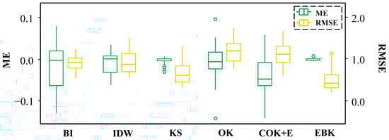 Mean error (ME) and Root Mean Square Error (RMSE) of the applied interpolation methods in downscaling the GCMs temperature data. IDW, Inverse Distance Weighting; BI, Bilinear Interpolation; KS, Kernel Smoothing; OK, Ordinary Kriging; COK+E, Cokriging plus Elevation; EBK, Empirical Bayesian Kriging.