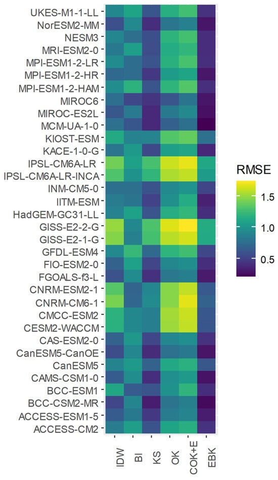 The outcomes regarding individual model deviations are illustrated in Figure 3. It is evident that EBK stands out as the method that minimizes RMSE to the greatest extent, with values equal to or less than 0.5 for the majority of GCMs. Even in models with certain “resistance” to interpolation, such as those from the IPSL and GISS families, along with KIOST, which consistently exhibit errors irrespective of the method employed, the application of EBK appears to mitigate these discrepancies. BI, KS, and to a lesser extent, IDW, also demonstrate considerable consistency. Conversely, both OK and COK+E display substantial errors, with values close to or exceeding 1.5 in RMSE for models from the CNRM, CMCC, and CESM2 families, and significant errors ranging between 1.0 and 1.5 in RMSE for numerous other GCMs (Hadley, MPI, or GFDL families), underscoring once again their inability to yield acceptable downscaling results.