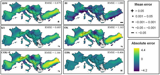 Regarding EBK, it shows its greatest strength in these findings, as the low error rate (Figure 2) and consistency among models observed previously (Figure 3) translate into remarkable spatial regularity. The entire range of data alteration through interpolation ranges from −1.15 °C (Czech Republic) to +1.41 °C (Eastern Turkey), significantly lower than that of any other method. However, despite specific zones, such as in most of the territory, the range of modification oscillates between +0.19 and +0.35 °C.