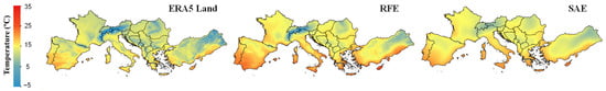 ERA5 Land, Random Forest Multi-Model Ensemble (RFE), and Simple Averages Multi-Model Ensemble (SAE) mean annual temperature in the Euro-Med.
