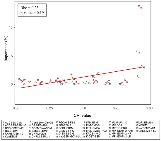 Finally, Figure 9 illustrates the correlation between the percentage importance assigned by the regression method used in the RFE and the CRI value obtained in the ranking (Table 2). Although a positive correlation detected between these variables (Rho = 0.23), it is not statistically significant (p > 0.05). Thus, it is observed that when performing an RFE with the total pool of analyzed GCMs, the regression method automatically discards several of them (GISS-E2-1-G, MPI-ESM1-2-LR, NESM3, etc.) by assigning them 0% importance. However, it also includes, although with little overall importance, models considered as “poor performers” (BCC-ESM1, MIROC6, and MIRPC-ES2L). At the same time, it discards “good performers” (IPSL models, HadGEM-GC31-LL, and UKES-M1-1-LL). In conclusion, we could argue that the majority of the assigned importance is distributed among three of the GCMs that performed best in the ranking: GFDL-ESM4 (14%), MRI-ESM2-0 (6%), and MPI-ESM1-2-HR (3%).