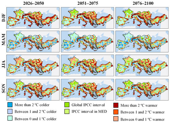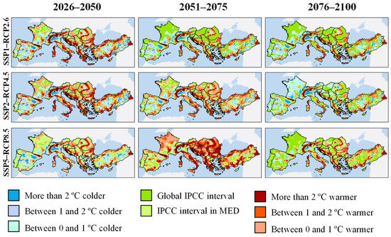 In this section, future projections regarding mean seasonal and annual temperature in the Euro-Med region for the short-term (2026–2050), medium-term (2051–2075), and long-term (2076–2100) periods, based on different emission scenarios (SSP1-RCP2.6, SSP2-RCP4.5, and SSP5-RCP8.5), will be established using the previously developed MME. The projections obtained in this study will be contextualized according to the predictions of the IPCC at both global and regional (Euro-Med) scales. The confidence intervals provided by the IPCC were obtained from the Interactive Atlas developed by the Working Group I for AR6 [103], and they are documented in Table A1 of Appendix A. The percentage of territory whose expected warming falls within the IPCC interval for each scenario and time window is presented in Table A2 of Appendix A.