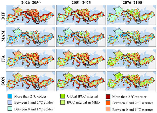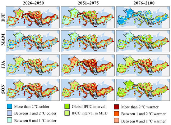 Seasonal temperature anomalies in Mediterranean Europe in the short (2026–2050), medium (2051–2075), and long (2076–2100) term under the SSP5-RCP8.5 emission scenario. Anomalies were established with respect to IPCC predictions globally and for the European Mediterranean region (MED).