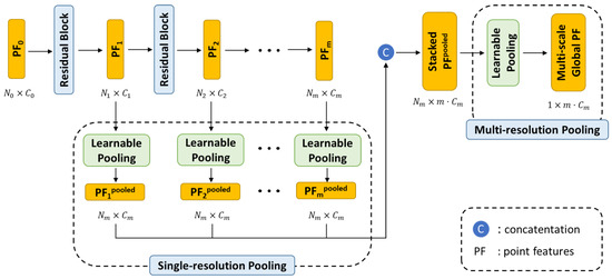 To prevent this problem, we propose a generalized pooling function—learnable pooling (LP)—that aggregates by calculating the weighted sum of all point features according to the correlation between the point features and learnable parameters. Since the LP does not neglect information from non-maximum point features, it can be used for aggregating both single-resolution and multi-resolution point features without loss of information.