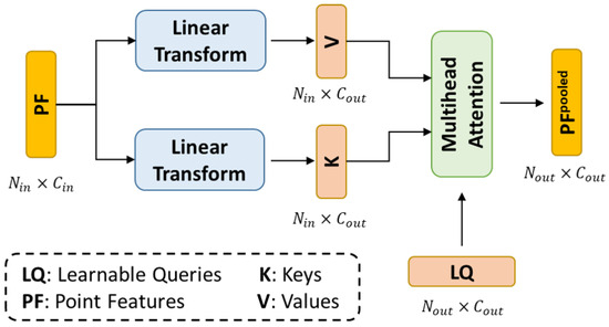 Let F be the input point feature matrix to the learnable pooling function . Furthermore, suppose that Q, K, and V are the query, key, and value matrices, respectively, for a scaled dot-product attention mechanism .
