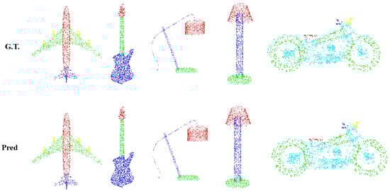 Visualization of the PointStack part segmentation ground truths (G.T.) and predictions (Pred). Qualitatively, the predictions are nearly identical to the ground truths.