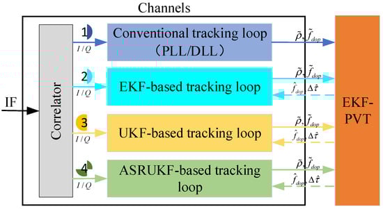 GNSS receivers acquire position, velocity, and time (PVT) information by tracking satellite broadcast signals in real time, demodulating navigation messages, and acquiring pseudo-range, Doppler frequency, and other observation information. Therefore, the tracking loop accuracy of the receiver directly determines the PVT accuracy. Traditional GNSS receivers usually adopt scalar tracking loops (STL) to track each satellite independently using individual pre-assigned channels, and the signal processing among each channel is independent of one another. This tracking mode is simple to implement, without interference and pollution between channels []. However, it ignores the inherent correlation of GNSS tracking loops to the receiver’s PVT information, so information cannot be shared between each channel. In contrast, vector tracking loops (VTL) interlink the tracking loops and navigation solutions of diverse channels, facilitating the exchange of information between them, which has been a topic of concern in recent years [,,,]. Compared with the STL, the VTL exploits and makes full use of the redundant information of different satellite signals and the intrinsic coupling between signal tracking and navigation solution. Its advantages include the following factors: (1) with the aid of navigation information, VTL mitigates the dynamic stress on the tracking loop, enhancing the dynamic performance of the receiver; (2) the VTL excels in balancing the correlation of information among receiver signal channels, showcasing superior performance in scenarios involving weak signal tracking and rapid retracking; (3) it also exhibits superior anti-interference performance.