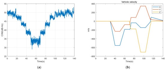 The simulation experiment scenario includes both signal attenuation and carrier motion. The vehicle motion is summarized in Table 2. The of signal strength was initially set to 50 dB-Hz and maintained at this level for 20 s. Subsequently, the signal strength was gradually reduced by 5 dB every 10 s until it reached a level of 30 dB-Hz, which was then maintained for a duration of 20 s. Finally, the signal strength was incrementally restored by 5 dB every 10 s until it returned to its original level of 50 dB-Hz. The signal variation remains consistent across all channels. The diagram in Figure 3 illustrates the phenomenon of signal attenuation and carrier dynamics, which present a significant challenge to the receiver tracking loop.