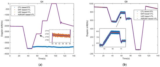 Using satellites G4 and G9 as examples, Figure 4 depicts their respective carrier Doppler frequency estimates. The observation from Figure 4a reveals that under conditions of relatively high and stable signal strength, all methods demonstrate effective tracking. However, as the signal strength diminishes and is accompanied by accelerated motion, the CTL-based STL loses its lock at 50 s. In contrast, the vector tracking loop combines all channel information and uses Doppler frequency feedback to assist the tracking, which can effectively track the signal dynamics under the weak signal of 30 dB-Hz.