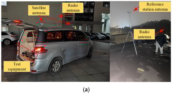 The vehicle verification platform is illustrated in Figure 5. The Trimble BD992 receiver is employed to deliver accurate position and velocity references. Operating in fixed RTK mode, the receiver demonstrated outstanding horizontal positioning accuracy of 0.8 cm and vertical positioning accuracy of 1.5 cm. The Gstar UTREK-210 IF signal collector is employed for the collection of the satellite’s IF signal, with the intermediate frequency and sampling rate . The two devices are interconnected through a power splitter, enabling them to share the same satellite antenna installed on the vehicle’s rooftop. It is worth noting that the Trimble receiver is capable of accurately measuring the vehicle’s heading information using dual-antenna technology. However, the heading information is not considered in this study. Nonetheless, the experimental process is fully demonstrated by showing all the experimental devices in Figure 5.