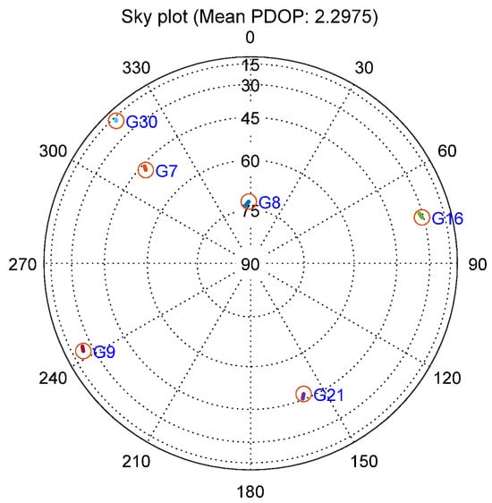 The vehicle experiment was conducted on city roads in Nanjing, China. Figure 6 depicts the trajectory of field vehicle experiment conducted in complex moving situations, including open sky, high buildings and trees, and other natural settings. The driving maneuvers encompassed acceleration, deceleration, and turning maneuvers. The data collection time started at UTC 11:28:46, 18 December 2021, and a duration of 200 s of data containing the aforementioned complex environment has been selected for analysis. A total of six satellites were acquired successfully in the experiment. The satellite sky-plot is displayed in Figure 7, with an average Position Dilution of Precision (PDOP) value of 2.2975.