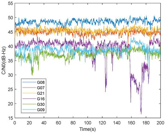 The is a critical metric for evaluating the strength of GNSS signal. To provide a more intuitive representation of the influence of GNSS signals during the experimental process, Figure 8 illustrates the of all channels calculated using STL method (Scheme 1). It is apparent that the remains relatively stable during vehicle operation; however, the G16 satellite signal exhibits a more significant decline when encountering severe occlusion. This significantly impacts the continuity of the tracking loop, potentially leading to inaccuracies in positioning results.