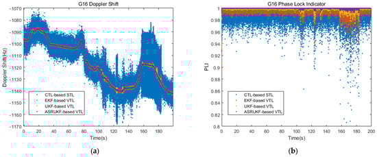 A closer look at Figure 8 reveals that the signal of satellite G16 experiences severe blockage in motion around 150 s, leading to a sharp decline in the and significantly impacting the tracking loop. Illustrated in Figure 9a, the Doppler frequency estimation of the conventional STL is notably affected within the corresponding signal interruption interval. However, the VTL can combine all the channel information and utilizes the PVT information calculated by the navigation solution module to estimate the carrier frequency. This enables continuous tracking even under short periods of signal interruption.
