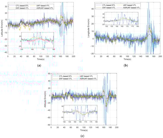 (a) Latitude errors, (b) longitude errors, and (c) altitude errors of all schemes.