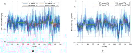 Furthermore, Figure 11 and Table 4 present the results of velocity error and their corresponding statistics, respectively, showing the same conclusion as the positions. The observation from Figure 11 reveals that the proposed ASRUKF-based VTL incorporates an adaptive adjustment mechanism to dynamically modify loop filtering parameters during vehicle operation, thereby exhibiting enhanced accuracy and robustness. Compared with UKF-based VTL, the velocity RMSE of ASRUKF-based VTL decreases by 7.14% and 9.09% in the east and north direction, respectively.