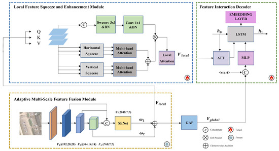 The overview of our proposed TSFE model for remote sensing image captioning. It consists of the adaptive multi-scale feature fusion module, local feature squeeze and enhancement module, and feature interaction decoder.