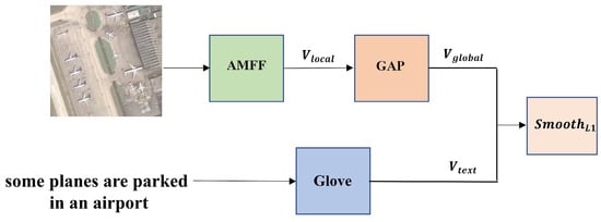 Our objective functions are divided into two parts: training for the fine-tuning task and training for the overall model. Initially, it is essential to provide an overview of the fine-tuning task. The Swin Transformer was pre-trained on the ImageNet dataset [44]. However, the ImageNet dataset mainly contains natural images, which are highly different from remote sensing images. Additionally, due to the differences between visual and text features, directly fusing the global features obtained from multi-scale features through GAP with text features can cause semantic mismatches. Therefore, we specifically designed a fine-tuning task and used and the GloVe embedding of the sentence to fine-tune the AMFF module on the remote sensing dataset, as shown in Figure 2.