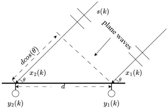 where a is the acoustic air propagation attenuation coefficient, t is the length of time it takes for the signal to travel from the acoustic source to the reference microphone, is the time delay between the second microphone and the reference microphone, and is the external noise at the second microphone. Since the source and the two microphones are in the same plane, the normal of the far-field acoustic signal wavefront is at an angle of to the line connecting the two microphones. Taking the received signal on the right as the reference signal, the received by the left microphone is delayed by (c is the speed of sound in the air) with respect to the , so that the time delay between the two microphones is: