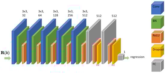 where is the network prediction, is the ideal prediction, and N is the number of predictions. Figure 7 illustrates the convolutional neural network architecture employed for the construction of Equation (26). In order to enhance the nonlinearity of the model as well as to reduce overfitting during training, two dropout layers with a dropout probability of 0.2 were added to the three fully connected layers. The horizontal and vertical step size of each convolutional layer in the network is 1, and padding is specified as the same mode.