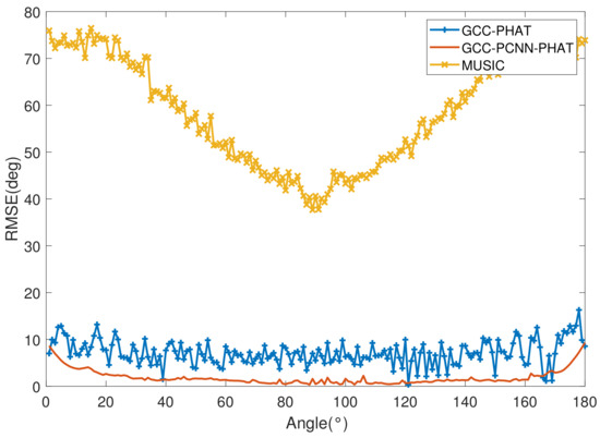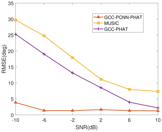 The PCNN algorithm, while outperforming the other two algorithms in terms of metrics at a length of 50, also loses the ability to reliably DOA estimate. The analysis here suggests that the reliability of PCNN is very much dependent on the feature matrix shown in Equation (25). And, is also generated on the basis of the cross-correlation computation, so essentially the reason for the failure of PCNN at low signal-to-noise ratios is the same as that of the GCC-PHAT algorithm, which belongs to incorrect cross-correlation results.