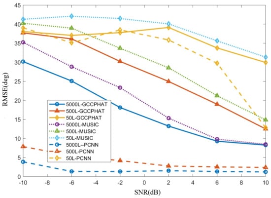 The audio length is directly related to the amount of computation required. According to Equation (22), a minimum of 49 points is theoretically sufficient to estimate the delay and thus the DOA when the array microphone spacing and sampling rate are fixed at 0.5 m and 16 kHz. Next, a simulation is performed to verify that the simulation is based on a configuration that is identical to the one in the previous section except for the change in audio length. The specific way to change the audio length is to intercept the first L samples, L = 5000, 500, 50, on each sample of length 16,000 or so. Figure 11 shows the RMSE performance of DOA estimation for different lengths of audio with different SNRs.