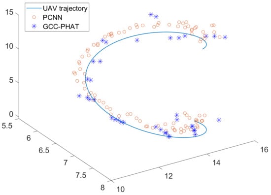 We first artificially set up a 3D curve as the simulated UAV trajectory and take 90 points uniformly on this curve, each point as the coordinates of the sound source at different moments, and Mic1 in Figure 2 as the origin of the coordinate system. The drone audio is used as the sound source, which is about 20 m away from the origin at its farthest point. The street sound is mixed into the signal received by the simulated microphone as noise, and the signal-to-noise ratio is set to 0 dB. Then, the localization simulation is carried out using the GCC-PHAT algorithm and algorithms, respectively. The simulation results are shown in Figure 14.