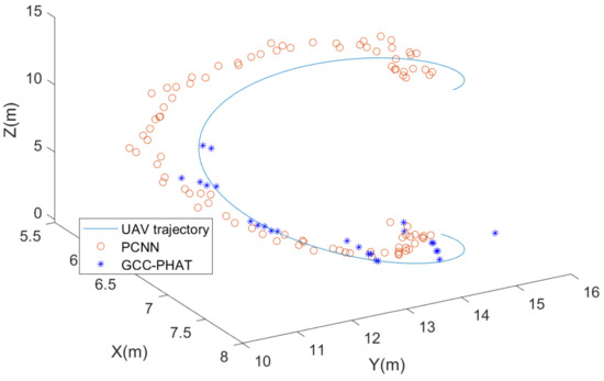 Based on the parameter settings of the previous simulation, we adjusted the SNR to −10 dB and kept the rest of the parameters unchanged, and the simulation results are shown in Figure 16. We found that when the height of the source exceeded 5 m, the GCC-PHAT algorithm could not estimate the pitch angle of the source properly under the SNR conditions, which led to an error in the second localization step (the pitch angle was estimated to be 0°). On the other hand, the PCNN algorithm proposed in this paper can form a coherent trajectory after the height of the sound source exceeds 5 m, and the form of the trajectory matches the simulated real trajectory, although the estimation error is larger than that in Figure 14, which is from 0.5 m to 1 m.