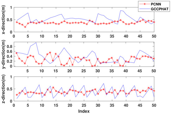 For the purpose of error comparison, here both algorithms keep the results of the first 50 simulation points. From Figure 17, the PCNN algorithm has a significantly smaller error in the x-direction than the GCC-PHAT algorithm, while the mean error in the y-direction is not significantly smaller than the GCC-PHAT algorithm as in Figure 15, but it is still slightly smaller. In the z-direction, the mean errors of the two algorithms are still similar, but the PCNN algorithm error curve is still more stable than the GCC-PHAT algorithm. In conclusion, compared with the GCC-PHAT algorithm, the PCNN algorithm can make the microphone array maintain better accuracy in UAV sound source localization with a lower signal-to-noise ratio.
