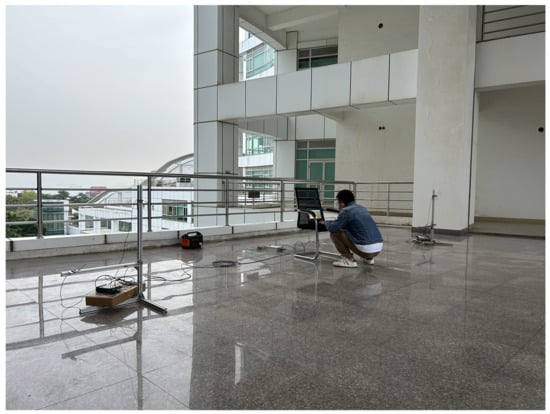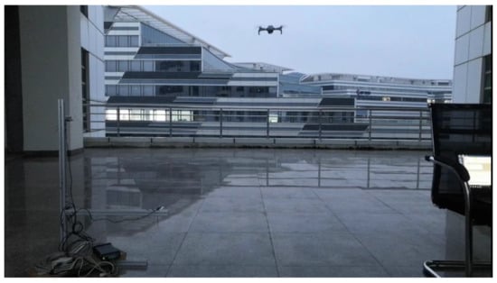 The experimental environment is shown in Figure 19, in which the devices have been connected and debugged. The experimental location is the terrace between Building A and Building B of the Innovation Building of Xiamen Software Park Phase I, adjacent to the road. The time of the experiment was around 17:20 on Friday, when the traffic was dense at the end of the day and the construction was in progress on the opposite side of the road, so the experimental environment was typical of urban noise.