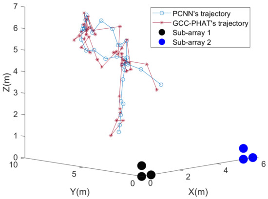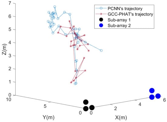 After the simulation analysis in the previous subsection, it is generally found that the GCC-PHAT delay estimation algorithm and our proposed PCNN delay estimation algorithm perform better in terms of DOA, so these two algorithms are used for the first step of DOA in the simulation in this subsection. The localization system is shown in Figure 2, and the spacing L between the two subarrays is set to 5 m.