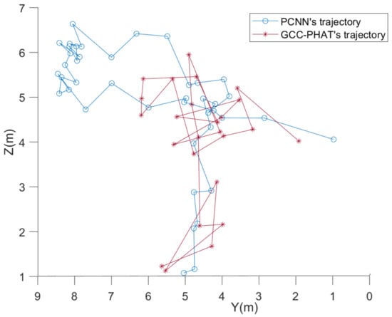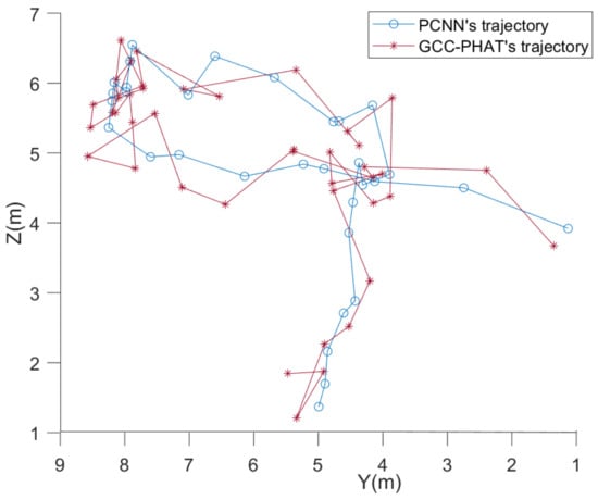 As can be seen from Figure 21, at a signal-to-noise ratio of about 2.3 dB, both methods can roughly localize the trajectory of the UAV and roughly match the planned one. The fluctuation of the localization coordinates of the PCNN algorithm is smaller than that of the GCC-PHAT algorithm when the sound source is farther away from the microphone array. Since the X coordinate value of the UAV set trajectory is unchanged, Figure 22 can show the difference between the two methods in more detail in the Y-Z plane. It can be seen that the overall fluctuations of the folds formed by the coordinates estimated by the PCNN algorithm are smaller compared to the GCC-PHAT algorithm.