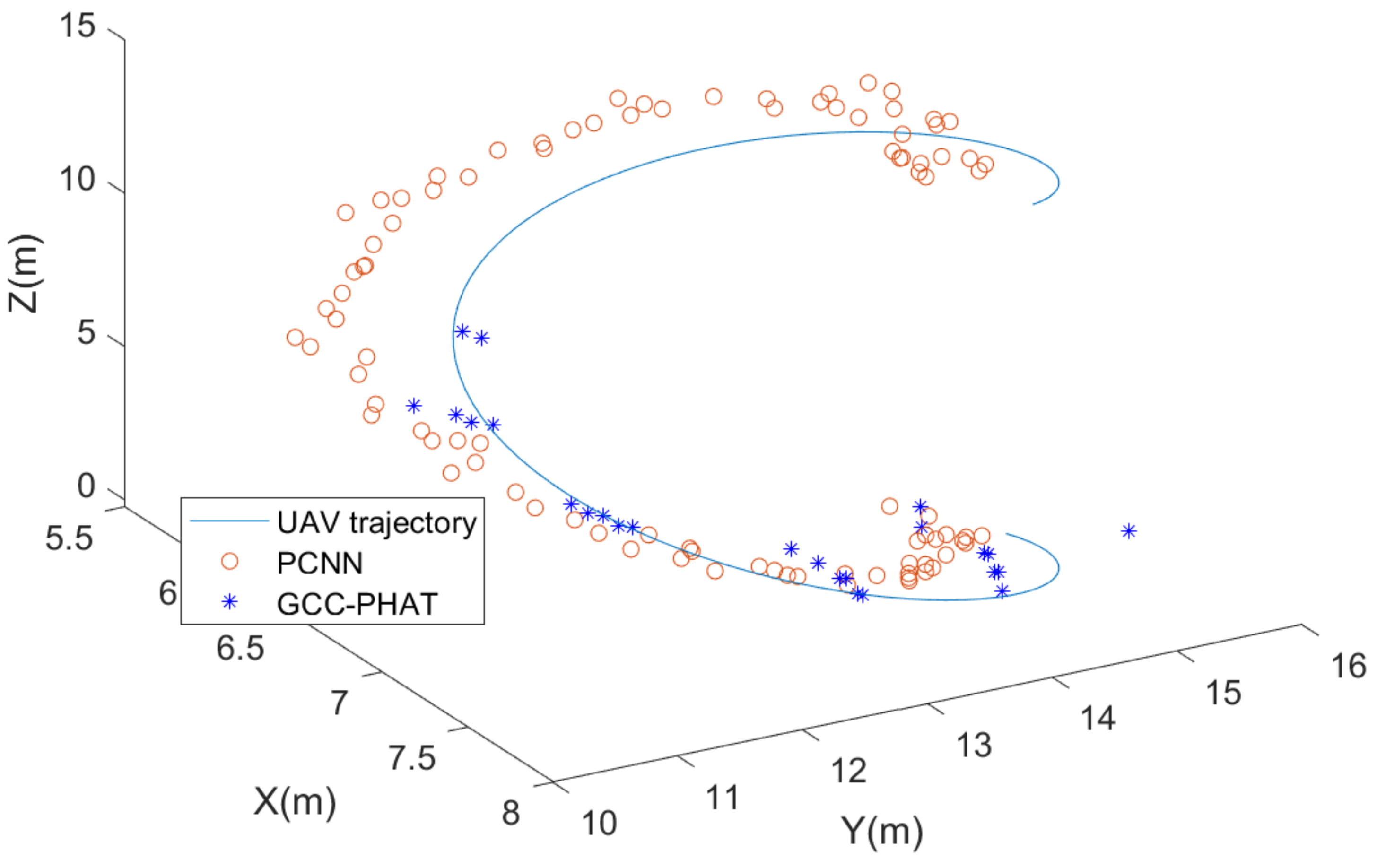 - Hilal, A.A.; Mismar, T. Drone Positioning System Based on Sound Signals Detection for Tracking and Photography. In Proceedings of the 2020 11th IEEE Annual Information Technology, Electronics and Mobile Communication Conference (IEMCON), Vancouver, BC, Canada, 4–7 November 2020; pp. 8–11. [Google Scholar]