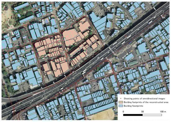 Building data used for this study (shooting points of omnidirectional images, building footprints, and aerial photographs). In our study, approximately, 100 m × 100 m of the orange-colored buildings were reconstructed.