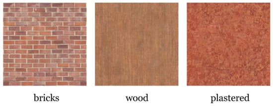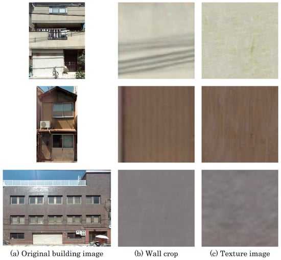 Texture images were prepared for training the texture synthesis model (Figure 3). In this study, 491 open-source texture images were downloaded from online image libraries (https://www.freepik.com/, https://www.pexels.com/ (accessed on 1 January 2022)). The images correspond to one of the three material classes (brick, wood, and plaster) as the reconstruction focused on a residential area in Japan, and most of the building surfaces were constructed from materials from these classes.