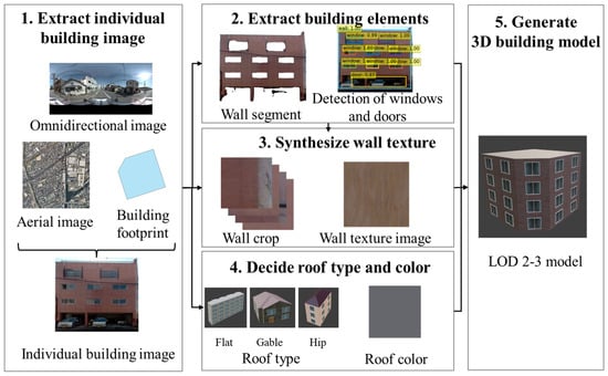 In this study, a framework for the automatic creation of 3D building models is proposed, as shown in Figure 4. The input data include omnidirectional street-view images, building footprints with attribute information, and aerial photographs. The framework is divided into five steps, which are explained later in this section.