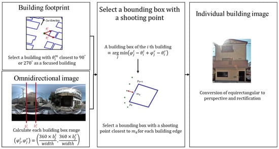 where () are the latitude and longitude of the shooting point, and the latitude and longitude of the vertex  of building  obtained from the GIS building footprint data are (). In addition, the range of existence of the building  was determined, based on the direction of travel, by subtracting the azimuth angle of the direction of travel of the vehicle from the azimuth angle range of each building. Of the buildings included in the omnidirectional image, those that were directly adjacent to the shooting point were captured from the front. However, other buildings were captured along an oblique angle, making it impossible to obtain accurate information about the building’s façade. Therefore, for each omnidirectional image, it was desirable to select and use only the buildings closest to the direction perpendicular to the direction of travel. Therefore, the center  was calculated for each range of existence of the building, and the building with  closest to 90° or 270° was selected as the building that was at the center of a particular omnidirectional image.