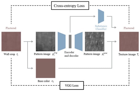 A wall crop contains a large amount of noise. Therefore, a new image from the wall crops was created, which was suitable as a texture model for the 3D building model. As shown in Figure 6, a texture synthesis model with an encoder–decoder structure was constructed by referring to an existing method []. The base color was calculated by averaging each pixel value in the crop  and subtracting the base color  to separate the pattern image . This was input to the encoder  and embedded into the feature vector . This embedding was then passed through the decoder  to generate a new pattern image, . Finally, a new texture image  was synthesized by combining this pattern  with the base color . In addition, a material classifier branch was set up to estimate the material class of the target image by passing the embedding through the classifier . Three classes (wood, plaster, and brick) were prepared for the building wall material. ResNet-18 was used as the main encoder, and a 5-layer CNN was used as the decoder, as reported in a recent study [].