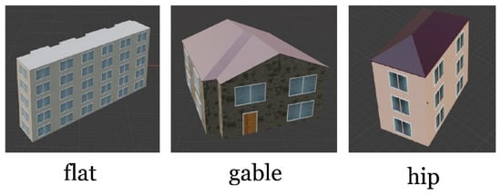 The roof type was determined based on the image classification of each building image. Three roof types were used in this study: flat, gabled, and hipped (Figure 7). Buildings have many different roof shapes. However, because our method was based on a single ground image, the problem was simplified by focusing on the three basic roof shapes mentioned above. The CNN model used was VGG16 [], which was pre-trained in ImageNet [] and fine-tuned using building images of Kobe City. The cross-entropy loss between the predictions and the correct labels was used for training.
