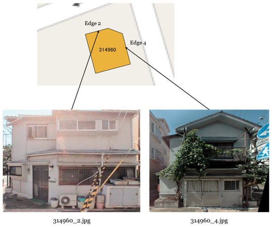 Following the flow shown in Figure 5, the building images were matched with the building edges. Figure 8 shows an example of a building with ID 314960. The images were correctly assigned to each side, whereas the sides occluded by the road were shown as blanks. This study focused on 81 buildings in Kobe. Nineteen of them were fully occluded and all sides were blank, which meant that the available images covered 76.5% of the buildings selected for this study. All sides, except the blank ones, were visually inspected to ensure that the associated images matched correctly. The accuracy of the matching was 86.9%, demonstrating the effectiveness of this method.