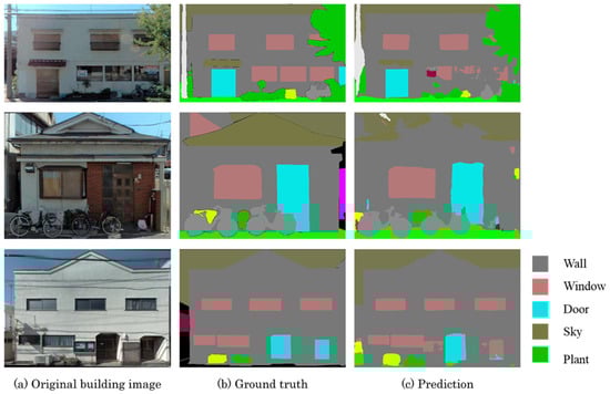 The semantic segmentation of the building image resulted in a pixel-based accuracy as high as 88.3%. Figure 9 shows the visual results: on the left is the original image, in the middle is the annotation data, and on the right is the prediction. In the predicted images, the wall surfaces were segmented in gray, and all were accurate. In the classes without the wall (for example, in the first row), the windows were sparsely distributed. This was presumably because the reflections on the glass were similar and could not be identified as windows.