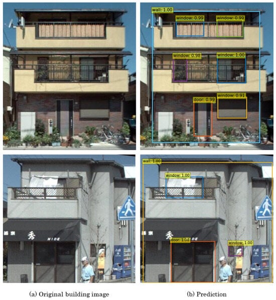 To identify the locations of windows and doors in a 3D building model, object detection for three classes of objects (windows, doors, and walls) was performed, and the locations of windows and doors relative to wall surfaces were calculated. A detection transformer (DETR) [] was used as the object detection model, which also fine-tuned the pre-trained model with the building images. The losses of the bounding boxes and the labels were used as training losses. The loss of the bounding boxes was calculated by combining the generalized intersection over union (IoU) loss [] and the L1 loss, whereas cross-entropy loss was used for the loss of the labels.