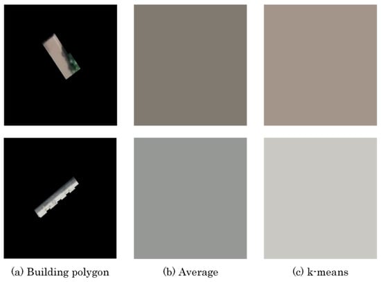 Figure 12 shows the results of the extraction process. For example, in the first row, there is a green area in the polygon because a tree covers the roof. Therefore, if all pixels were averaged, the result would be a greenish color; however, the k-means++ method was able to extract the main reddish-brown color. The second row also contains the shaded areas in the polygons, which resulted in a dark gray color when averaged. However, the k-means++ method could extract the bright gray color.