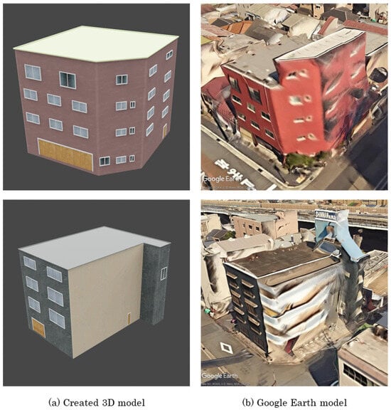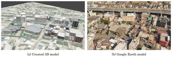 Figure 13 shows the generated 3D and Google Earth models of the area. A comparison confirmed that the roof shape obtained using the proposed method was significantly different from the shape determined in Google Earth. For example, although it was correctly determined that a building had a gable roof, the direction of the ridge was not recognizable, resulting in different roof shapes. Compared with the latest studies, methods using aerial images or LiDAR can reproduce a variety of roof shapes of buildings over a wide area and are more accurate than our method [,]. The disadvantage of our study is that it cannot represent complex roof shapes because it classifies them into three types.