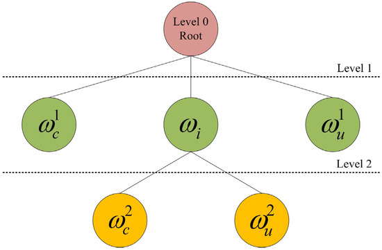 Its tree topology is depicted in Figure 2. Specifically, it starts from the root of the tree standing for a unique class including all the samples. In the first level, because of its simplicity and applicability, the FCM is used to divide the root node into three child nodes, respectively, representing the changed, unchanged, and intermediate classes (i.e., , , and ), respectively. Pixels classified into and exhibit a high likelihood of being changed and unchanged. In the second level, the internal node is further divided into two leaves and using the nearest neighbor rule by comparing the distances of the corresponding Gabor feature vectors to the centroids of and . Ultimately, we integrate two-level subclusters to construct the change map.