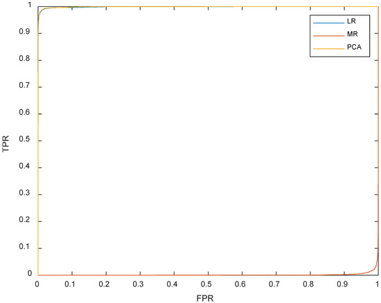 To evaluate the efficacy of the difference images (DIs) calculated by the LR, MR, and PCA-fusion approaches, empirical receiver operating characteristic (ROC) curves are employed, as depicted in Figure 11. These curves plot the true positive rate (TPR) against the false positive rate (FPR). Additionally, two quantitative criteria based on the ROC curve—the area under the curve (AUC) and the diagonal distance (Ddist)—along with their metrics [46], are provided in Table 3. For these criteria, larger values indicate superior detection performance. According to the data in Table 3, the PCA fusion model outperforms both the LR and MR operators, showcasing its effectiveness in change detection scenarios.