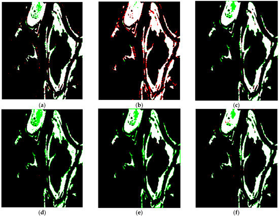 Figure 12 presents the change detection outcomes for the Village of Feltwell dataset using the difference images processed with the two-level clustering model, with the associated performance metrics detailed in Table 4. From these visuals and data, it is observed that the log-ratio with two-level clustering (LRTLC) method exhibits the fewest false positives, with an FP value of 77. Meanwhile, the mean-ratio with two-level clustering (MRTLC) approach shows the least number of missed detections, evidenced by the FN value of 124. The PCA with two-level clustering (PCATLC) method ranks second in terms of both FN and FP, but it achieves the best performance in overall error (OE), percentage of correct classifications (PCC), Kappa coefficient (KC), and F1-score, with values of 360, 99.77%, 95.54%, and 95.66%, respectively. These results demonstrate the superior change detection capability of the fused difference image approach.